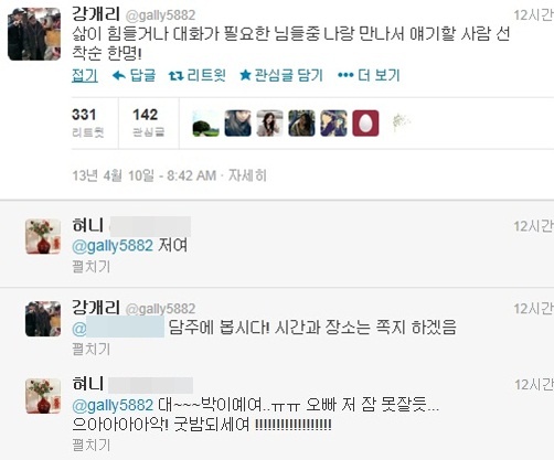 [아시아경제 장영준 기자]그룹 리쌍의 개리가 남다른 팬서비스로 이목을 집중시켰다.개리는 11일 새벽 자신의 트위터에 "삶이 힘들거나 대화가 필요한 님들 중 나랑 만나서 얘기할 사람 선착순 한 명!"이라는 글을 남겼다.이에 한 여성팬이 "저요"라고 답했고, 개리는 "다음 주에 봅시다. 시간과 장소는 쪽지 하겠음"이라고 응수해 눈길을 끌었다. 이 여성팬은 "대박이에요. 오빠 저 잠 못 잘 듯"이라며 기쁜 마음을 감추지 못했다.누리꾼들은 "개리 팬서비스 진짜 대박" "한 번 더 해요. 제발" "진짜 만나는 거예요? 인증샷 올려줘요" 등의 반응을 보였다.장영준 기자 star1@<ⓒ아시아경제 & 스투닷컴(stoo.com)이 만드는 온오프라인 연예뉴스>