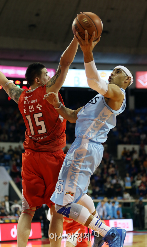 [아시아경제 정재훈 기자] 13일 오후 서울 잠실학생체육관에서 열린 'KB국민카드 2012~2013 프로농구' 서울 SK 나이츠와 울산 모비스 피버스의 챔피언결정전 1차전. 모비스 문태영이 SK 김민수를 피해 슛을 시도하고 있다. 정재훈 기자 roze@<ⓒ세계를 보는 창 경제를 보는 눈, 아시아경제(www.asiae.co.kr) 무단전재 배포금지>
