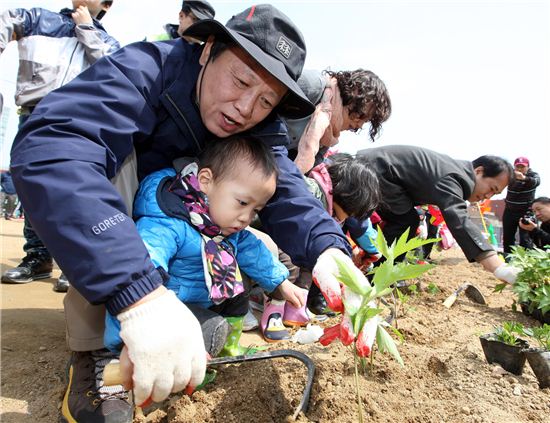 차성수 금천구청장이 어린아이들과 함께 텃밭에 준비해온 농작물을 심고 있다.<br />