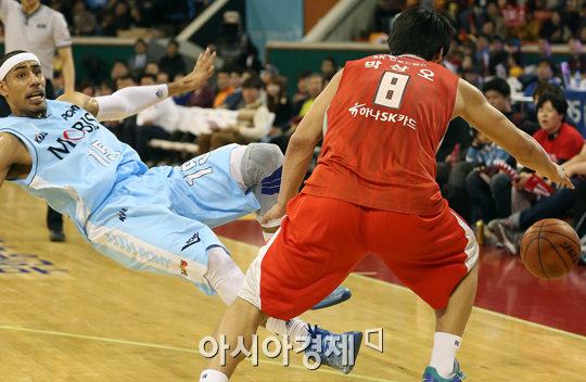 [아시아경제 정재훈 기자] 13일 오후 서울 잠실학생체육관에서 열린 'KB국민카드 2012~2013 프로농구' 서울 SK 나이츠와 울산 모비스 피버스의 챔피언결정전 1차전. 모비스 문태영이 SK 박상오에게 밀려 넘어지고 있다. 정재훈 기자 roze@<ⓒ세계를 보는 창 경제를 보는 눈, 아시아경제(www.asiae.co.kr) 무단전재 배포금지>