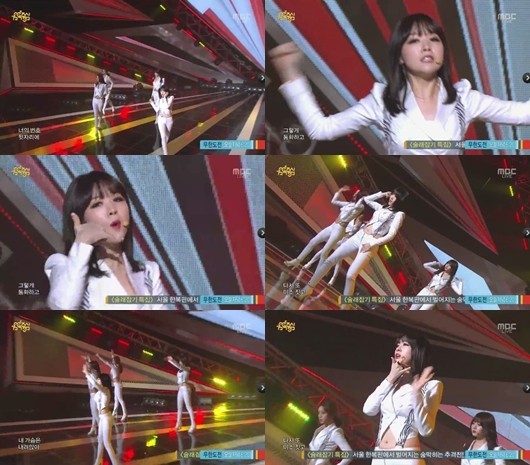[아시아경제 이금준 기자]걸그룹 걸스데이가 성숙한 섹시미를 과시했다. 걸스데이는 4월 13일 오후 방송한 MBC '음악중심'에 출연해 타이틀곡 '기대해'를 불렀다.이날 걸스데이는 일명 '멜빵 춤'으로 불리는 농염한 댄스를 선보였다. 이들의 파격적인 퍼포먼스와 무대매너는 팬들의 시선을 단번에 사로잡았다. 민아와 소진의 안정적인 라이브 실력 역시 무대의 완성도를 높이는데 한 몫 했다. 신곡 '기대해'는 걸스데이의 히트곡 '반짝반짝'을 작곡한 작곡가 남기상이 총 프로듀싱을 맡은 노래로 아날로그와 일렉트로닉이 조화를 이루는 하이브리드 사운드 댄스곡이다. 한편 이 날 방송에는 걸스데이를 비롯해 서인국, 소녀시대-태티서, 케이윌, 틴탑, 다비치, 제아파이브, G.NA, 박재범, 비투비, 인피니트, 피프틴앤드, 레이디스 코드, M.I.B, 디유닛, 길구봉구, 이블, 퓨어, 루나플라이가 출연했다.이금준 기자 music@<ⓒ아시아경제 & 스투닷컴(stoo.com)이 만드는 온오프라인 연예뉴스>