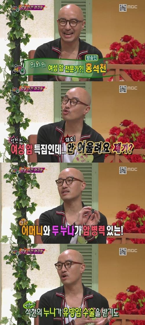 [아시아경제 이금준 기자] '홍석천은 여성암 전문가다?'13일 밤 방송한 MBC '세상을 바꾸는 퀴즈'(이하 '세바퀴')에서는 방송인 홍석천이 '여성암 전문가'로 소개돼 눈길을 끌었다.이에 MC 박미선이 깜짝 놀라자 홍석천은 "왜 안 어울리느냐"라고 발끈하는 모습을 보여 웃음을 자아냈다.그는 이어 "어머니와 두 누나가 암 병력이 있다. 지난해 누나가 유방암 수술을 받았다"며 "항암 치료를 옆에서 지켜보다보니 참 할 말이 많다"고 '여성암 전문가'로 소개된 배경을 설명했다.한편, '암을 이긴 여자들' 특집으로 진행된 이날 '세바퀴'에는 자궁암을 앓았던 양희은을 비롯해 암 전력이 있는 하미혜와 홍여진 등이 출연했다.이금준 기자 music@<ⓒ아시아경제 & 스투닷컴(stoo.com)이 만드는 온오프라인 연예뉴스>