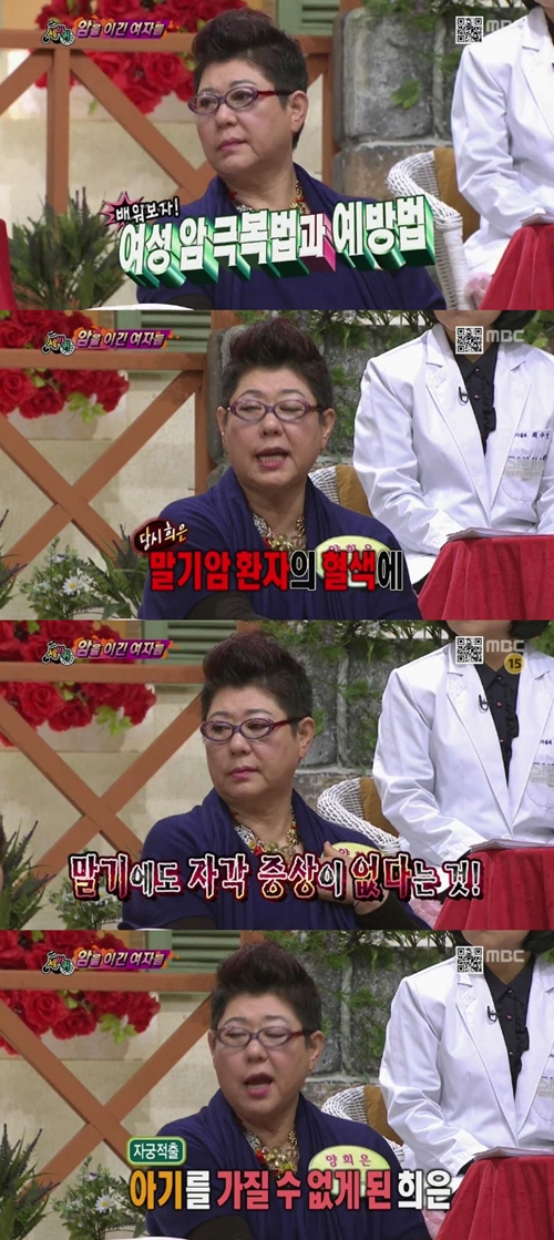 [아시아경제 이금준 기자] "3개월 시한부 선고를 받았다."양희은은 13일 밤 방송한 MBC '세상을 바꾸는 퀴즈'(이하 '세바퀴')에 출연해 "1982년 점액성 난소암 판정을 받았다"며 이같이 고백했다.그가 앓았던 점액성 난소암은 암세포가 물주머니 형태로 생기는 질환. 만약 이 물주머니가 터질 경우 전신에 번지는 악질 병이었다.양희은은 시한부 선고를 받았던 심경에 대해 "사실 나는 몰랐다. 가족들이 숨겼다. 단순히 '15kg 혹을 떼면 날씬해지겠구나' 생각했다"고 웃어보였다.아울러 그는 이날 '세바퀴'에서 암 투병으로 인해 바꾼 식습관과 생활 등을 소개해 주위의 관심을 받았다.한편, '암을 이긴 여자들' 특집으로 진행된 이날 '세바퀴'에는 점액성 자궁암을 앓았던 양희은을 비롯해 암 전력이 있는 하미혜와 홍여진 등이 출연했다.이금준 기자 music@<ⓒ아시아경제 & 스투닷컴(stoo.com)이 만드는 온오프라인 연예뉴스>