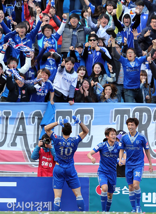 [아시아경제 정재훈 기자] 14일 오후 경기 수원월드컵경기장에서 열린 '현대 오일뱅크 K리그 클래식 2013' 수원 삼성과 FC서울의 슈퍼매치. 동점골을 터뜨린 라돈치치가 기뻐하고 있다.정재훈 기자 roze@<ⓒ세계를 보는 창 경제를 보는 눈, 아시아경제(www.asiae.co.kr) 무단전재 배포금지>