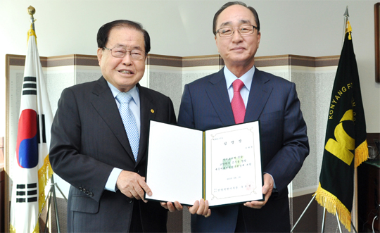 심대평(오른쪽) 전 자유선진당 대표가 김희수 건양대학교 총장으로부터 임용장을 받은 뒤 기념사진을 찍고 있다.