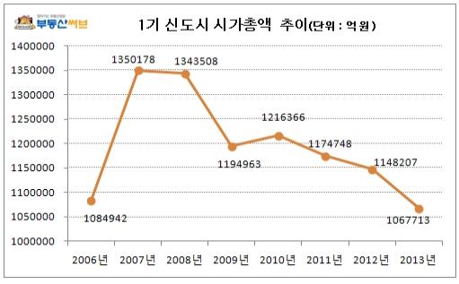 [아시아경제 박미주 기자]6년새 1기 신도시 아파트 시가총액이 28조원 이상 하락한 것으로 나타났다. 16일 부동산정보업체 부동산써브에 따르면 4월 둘째주 기준 1기 신도시 아파트 총 27만7019가구의 시가총액은 106조7713억 원으로 조사됐다. 이는 고점이던 2007년 4월 둘째주 135조178억원보다 28조2465억원 줄어든 액수다. 고점대비 감소한 1기 신도시 시가총액 28조2465억원 중에는 중대형(전용면적 85㎡ 초과) 시가총액 하락 비중이 약 83%(23조3406억 원)에 달할 정도로 컸다. 반면 중소형(전용면적 85㎡ 이하) 시가총액 하락 비중은 약 13%(4조9059억원)로 낮았다. 특히 분당 중대형 시가총액은 2007년 4월 당시 40조1570억원이었지만 현재는 13조3347억원 감소한 26조8223억 원으로 급락했다. 일산 중대형은 4조2852억원 감소한 8조7507억원, 평촌 중대형은 2조4500억 원 감소한 5조7768억원, 산본 중대형은 1조6877억원 감소한 4조5758억원, 중동 중대형은 1조5831억원 감소한 5조5065억원이다. 분당은 중소형 시가총액 감소도 가장 컸다. 분당 중소형 시가총액은 2007년 4월 23조6524억원이었으나 현재는 3조2086억원 감소한 20조4438억원으로 낮아졌다. 일산 중소형도 1조7836억원 감소한 11조150억원으로 1조원이 넘는 하락폭을 보였다. 그러나 1기 신도시 가격 전망이 계속 비관적인 것은 아니다. 조은상 부동산써브 부동산리서치팀장은 "1기 신도시는 아파트 노후화를 제외하면 서울 접근성이나 인프라 측면에서 충분한 경쟁력을 갖추고 있다"면서 "특히 4·1부동산대책에서 수직증축 리모델링을 허용하는 방안이 포함되며 가격 반등 기대감이 커지고 있다"고 말했다. 이어 "리모델링 규제가 어느 정도까지 완화되고 얼마나 빨리 시행될 것인지가 향후 가격 등락의 중요 포인트가 될 것"이라고 전망했다.박미주 기자 beyond@<ⓒ세계를 보는 창 경제를 보는 눈, 아시아경제(www.asiae.co.kr) 무단전재 배포금지>