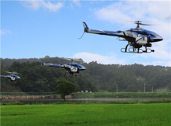 ▲원신스카이텍이 개발한 무인헬기 '엑스콥터(X-Copter)'가 편대를 지어 공동방제작업을 수행하고 있다.(자료제공=LGCNS)