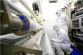 LG화학 연구원들이 3D FPR필름 생산라인에서 공정을 살피고 있는 모습.