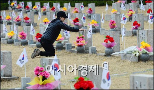 [아시아경제 최우창 기자]4.19혁명 53주년을 하루 앞둔 18일 서울 강북구 수유동 국립4.19민주묘지에서 한 시민이 묘역에서 묵념을 하고 있다. 최우창 기자 smicer@<ⓒ세계를 보는 창 경제를 보는 눈, 아시아경제(www.asiae.co.kr) 무단전재 배포금지>