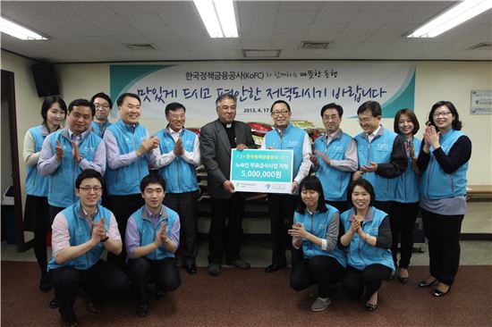 [아시아경제 김현정 기자] 한국정책금융공사 임직원들은 지난 17일 서울 용산에 위치한 시립 '다시서기 종합지원센터' 에서 노숙인을 위한 무료급식 봉사활동을 진행했다. (뒷줄 오른쪽 다섯번째부터)진영욱 정책금융공사 사장, 여재훈 다시서기 종합지원센터 신부가 배식 봉사 후 후원품을 전달하며 기념촬영을 하고있다. 김현정 기자 alphag@<ⓒ세계를 보는 창 경제를 보는 눈, 아시아경제(www.asiae.co.kr) 무단전재 배포금지>