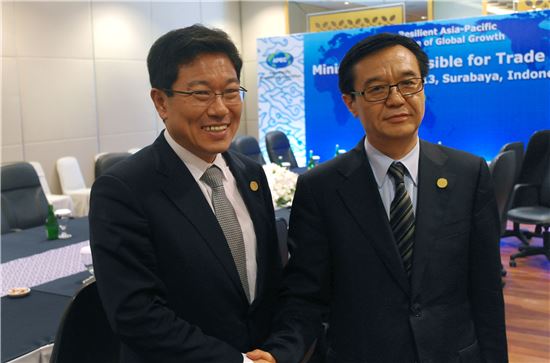 [아시아경제 김혜원 기자] 윤상직 산업통상자원부 장관은 20일(현지시간) 인도네시아 수라바야 메리트호텔에서 2013 APEC 통상장관회의에 참석 중인 까오후청 중국 상무부장과 한-중국 양자회담을 가졌다.김혜원 기자 kimhye@<ⓒ세계를 보는 창 경제를 보는 눈, 아시아경제(www.asiae.co.kr) 무단전재 배포금지>