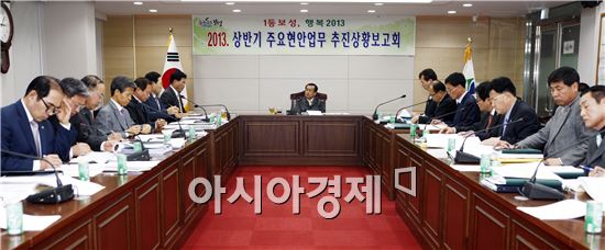 전남 보성군(군수 정종해)이 23일 군청 소회의실에서 각 실과소별 2013년도 상반기 현안업무 추진상황 보고회를 가졌다. 이번 보고회는 주요 현안 71개 사업 추진에 따른 문제점과 대책, 사업 추진 과정에서 어려움이 있거나 부진한 사업, 군민 관심사업, 대규모 추진사업 등을 함께 논의하며 해결 방안을 모색해 보는 시간이 됐다. 특히 기획예산실 주요 현안사업인 '인구 5만 회복 운동'을 적극 추진하기 위해서는 공무원뿐만 아니라 관내 기관단체 임직원, 기업체 근무자들의 '내 직장, 내 고향 주소 갖기' 참여가 중요하므로 그에 따른 전입을 유도하는 방안을 모색했다. 또한 문화관광과 현안사업 보고에서는 문화예술회관 건립과 서편제 보성소리 테마파크, 관광녹차 생태공원 조성, 율포해수욕장 관광지 개발사업 등 현재 추진되고 있는 대규모 사업에 대한 심도 있는 토론으로 사업 추진이 탄력을 받을 것으로 기대된다. 비봉농어촌 테마공원 조성사업에 대하여는 공룡공원 및 리조트, 선소낚시공원 조성사업등과 연계하여 또 하나의 관광단지를 생성하여 체류형 관광지가 될 수 있도록 사업추진에 만전을 다하기로 했다. 정종해 보성군수는 현안 업무보고를 통해 직원들의 노고를 격려하면서 “사업의 설계부터 꼼꼼히 검토하여 예산 낭비가 되지 않도록 하고, 사업 성격에 맞는 콘텐츠를 발굴하여 관광객을 끌어들이고, 시설물 운영활성화에 적극 노력하자“고 강조했다. 아울러 “공무원의 끊임없는 노력과 생각이 주민의 삶의 질 향상과 직결되어 있다”면서 ”부서장을 중심으로 역량을 집중시켜 풍요로운 보성, 1등 보성을 건설하자“며 공직자 모두가 최선을 다해 줄 것을 당부했다.노해섭 기자 nogary@<ⓒ세계를 보는 창 경제를 보는 눈, 아시아경제(www.asiae.co.kr) 무단전재 배포금지>