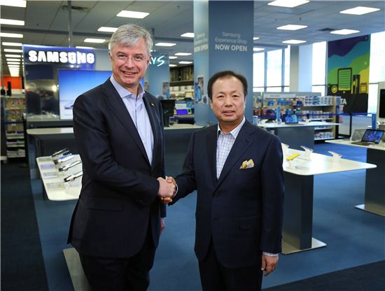 [아시아경제 권해영 기자]신종균 삼성전자 사장과 유베르 졸리 베스트바이 사장은 24일(현지시간) 미국 뉴욕 맨하탄 유니언 스퀘어에 위치한 베스트바이 매장에서 열린 미국 베스트바이 매장 내 '삼성 체험 매장(Samsung Experienxe Shop)' 개장 행사에 참석해 양사간 협력 체결을 공식 발표했다. 삼성전자는 올해 상반기까지 미국 전역의 1400여개 베스트바이 매장에 숍인숍 형태로 삼성 체험 매장을 개장할 계획이다.