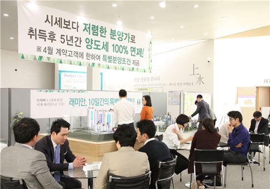 래미안 용산 견본주택에서 방문객들이 분양담당자에게 상담을 받고 있다.
