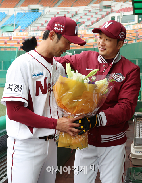 [아시아경제 정재훈 기자] 25일 오후 서울 목동야구장에서 '2013 한국야쿠르트 세븐프로야구' 넥센 히어로즈와 두산 베어스의 경기에 앞서 최경철과 1:1 트레이드를 통해 넥센 유니폼을 입게 된 서동욱이 선수단과 상견례를 가졌다. 넥센 주장 이택근이 서동욱에게 꽃다발을 전달하고 있다.정재훈 기자 roze@<ⓒ세계를 보는 창 경제를 보는 눈, 아시아경제(www.asiae.co.kr) 무단전재 배포금지>