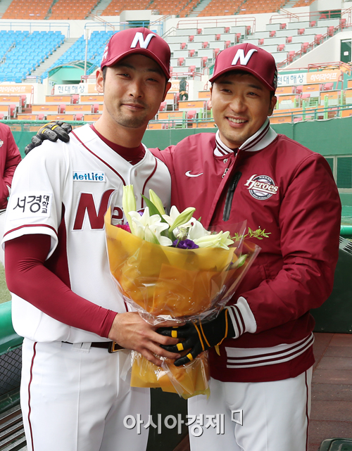 [아시아경제 정재훈 기자] 25일 오후 서울 목동야구장에서 '2013 한국야쿠르트 세븐프로야구' 넥센 히어로즈와 두산 베어스의 경기에 앞서 최경철과 1:1 트레이드를 통해 넥센 유니폼을 입게 된 서동욱이 선수단과 상견례를 가졌다. 넥센 주장 이택근이 서동욱에게 꽃다발을 전달하고 있다.정재훈 기자 roze@<ⓒ세계를 보는 창 경제를 보는 눈, 아시아경제(www.asiae.co.kr) 무단전재 배포금지>