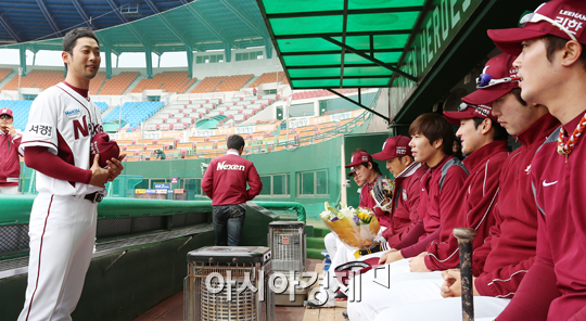 [아시아경제 정재훈 기자] 25일 오후 서울 목동야구장에서 '2013 한국야쿠르트 세븐프로야구' 넥센 히어로즈와 두산 베어스의 경기에 앞서 최경철과 1:1 트레이드를 통해 넥센 유니폼을 입게 된 서동욱이 선수단과 상견례를 가졌다. 서동욱이 각오를 밝히고 있다.정재훈 기자 roze@<ⓒ세계를 보는 창 경제를 보는 눈, 아시아경제(www.asiae.co.kr) 무단전재 배포금지>