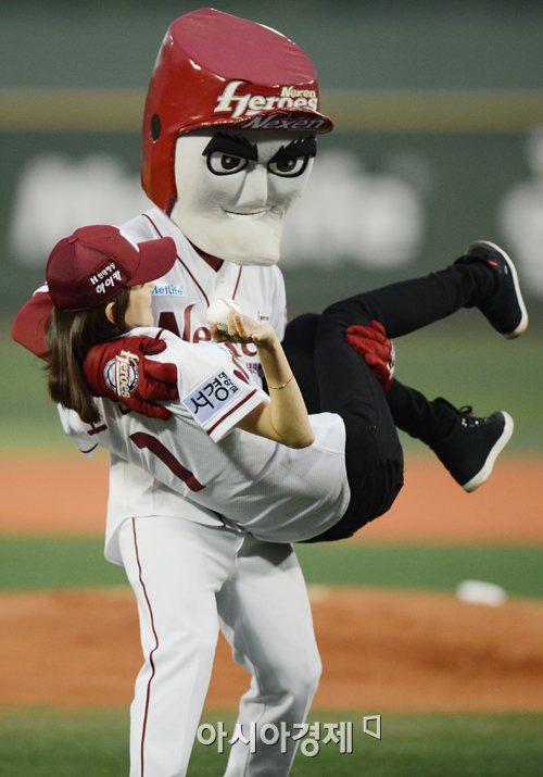 [아시아경제 정재훈 기자] 25일 오후 서울 목동야구장에서 열린 '2013 한국야쿠르트 세븐프로야구' 넥센 히어로즈와 두산 베어스의 경기. 시구자로 나선 배우 오인혜가 턱돌이에게 안겨 마운드로 향하고 있다.정재훈 기자 roze@<ⓒ세계를 보는 창 경제를 보는 눈, 아시아경제(www.asiae.co.kr) 무단전재 배포금지>