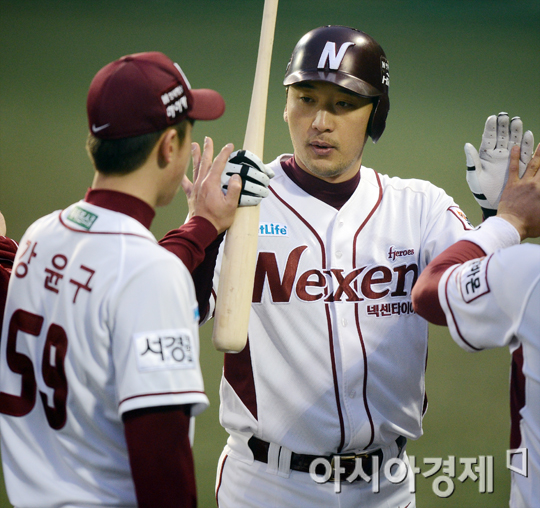 [아시아경제 정재훈 기자] 25일 오후 서울 목동야구장에서 열린 '2013 한국야쿠르트 세븐프로야구' 넥센 히어로즈와 두산 베어스의 경기. 1회말 2사 무주자 상황에서 이택근이 좌익수 뒤 홈런을 쳐낸 뒤 선발투수 강윤구와 기뻐하고 있다.정재훈 기자 roze@<ⓒ세계를 보는 창 경제를 보는 눈, 아시아경제(www.asiae.co.kr) 무단전재 배포금지>