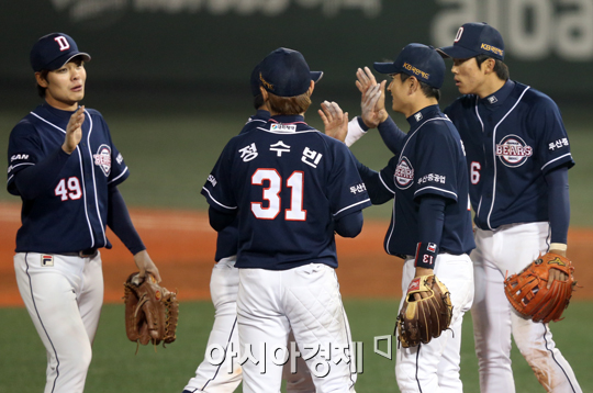 [아시아경제 정재훈 기자] 25일 오후 서울 목동야구장에서 열린 '2013 한국야쿠르트 세븐프로야구' 넥센 히어로즈와 두산 베어스의 경기. 연장 접전 끝에 6:3 승리를 거둔 두산 선수들이 기뻐하고 있다.정재훈 기자 roze@<ⓒ세계를 보는 창 경제를 보는 눈, 아시아경제(www.asiae.co.kr) 무단전재 배포금지>