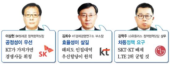 [아시아경제 심나영 기자, 김영식 기자] 이동통신 3사가 주파수 경매를 놓고 혈투를 벌이고 있다. 주파수 확보는 더 빠른 데이터 서비스를 위한 핵심재료. 무제한 통화로 음성수익을 포기하고 데이터 수익에 올인한 상황에서 주파수 확보는 각사의 사활이 걸린 문제다.미래부가 경매로 내놓을 물건은 LTE 서비스에 활용할 수 있는 1.8㎓ㆍ2.6㎓ 대역. 문제는 1.8㎓가 어느 이통사의 품에 안길 것이냐다. 1.8㎓를 가장 원하는 곳은 KT다. KT는 이미 1.8㎓대역 전국망 LTE 주파수를 확보하고 있어 바로 옆에 붙어있는 주파수 대역을 또 얻게되면 대역폭을 획기적으로 넓힐 수 있다. 경쟁사인 SK텔레콤과 LG유플러스는 온몸으로 이를 막으려 하고 있다. 올해 하반기 주파수 경매를 앞두고 '공정성'을 내세우는 이상헌 SK텔레콤 정책협력실장, '효율성'을 주장하는 김희수 KT경제경영연구소 부소장, 3위 사업자를 위한 '차등성'을 요구하는 강학주 LG유플러스 정책협력담당의 목소리를 들어봤다. ◆ SKT = "공정성이 우선.. KT가 가져가면 경쟁사들 휘청"SK텔레콤은 무엇보다 KT가 1.8㎓ 대역을 가져가는 것을 가장 경계하고 있다. SK텔레콤이 원하는 안은 "1.8㎓ 대역 경매에 SK텔레콤과 KT 참여를 아예 배제하고 LG유플러스에게 할당한다"는 것이다. KT에 대해 과도한 혜택이 부여된다는 논리로, 주파수를 공정하게 배분 하려면 LG유플러스에게 몰아줘야 한다는 것이다. SK텔레콤은 1.8㎓에 보조 LTE 주파수를 갖고 있긴 하지만, KT처럼 인접대역에 붙여 광대역화를 꾀할 수가 없는 상황이다. 이상헌 상무는 "KT가 1.8㎓를 가져가면 일부 설비만 추가해 전국에서 광대역 서비스를 할 수 있어 사실상 공짜로 경쟁우위를 얻는 것"이라며 "이 경우 SK텔레콤과 LG유플러스는 심각한 경쟁열위에 처하게 될 것이며 결국 시장 이상과열과 소모적 보조금 경쟁에 내몰리는 악순환을 피할 수 없다"고 우려했다.◆ KT = "효율성 추구해야.. 해외도 인접대역 우선할당이 원칙"KT는 '효율성만이 살길'이라고 말한다. 김희수 상무는 해외 사례를 들어 "경제협력개발기구(OECD) 회원국의 주파수 할당을 보면 인접대역을 포함한 광대역화를 정책의 기본원칙으로 두고 있다"고 강조했다. 포르투갈, 이탈리아, 스위스, 독일 등의 사례를 보면 경매 설계시 인접대역 우선 할당 원칙을 명시했고 특정사의 기존 대역에 인접했다는 이유로 참여를 막은 사례도, 시장경쟁구도가 왜곡된 사례도 없었다는 것이다. 또 KT가 단숨에 경쟁우위를 가져간다는 주장도 반박했다. 김 상무는 "KT는 3사 중 가장 늦게 LTE 서비스에 나섰다"면서 "아직 KT는 타사처럼 주파수 두개를 활용해 LTE 속도를 높이는 멀티캐리어(MC)를 시작하지 못했다"고 설명했다. 그는 “전국망이 구축되는 1~2년이 지나면 3사의 총 투자액은 비슷해진다”면서 “7조원 이상의 격차가 난다는 주장은 과장된 것”이라고 강조했다. ◆ LGU+ = "해외와 단순비교 안돼.. KT로 가입자 쏠림 막아야"3위 사업자인 LG유플러스는 이런 위치를 역으로 이용해 '차등정책'을 요구하고 있다. SK텔레콤과 함께 "1.8㎓ 대역 경매에 SK텔레콤과 KT 참여를 아예 배제하고 LG유플러스에게 할당한다"는 안을 밀고 있는 것. KT의 독주를 막아 LTE 2위 자리만은 확실히 굳히겠다는 의지다. 강학주 상무는 "LG유플러스가 새 대역에서 광대역을 할당받게 되면 전국망 구축을 위해 새 투자를 해야 하지만, KT가 인접대역을 가져갈 경우 총 7조3000억원의 초과 수익을 가져가 투자비 불균형이 생긴다"고 분석했다. LTE서비스는 한국이 세계에서 가장 앞서기 때문에 KT의 주장대로 유럽과 단순 비교는 금물이란 지적도 잊지 않았다. 그는 "이용자들의 판단 기준은 속도로, LTE가 시작된지 1년 8개월만에 국내 이동통신 가입자 절반이 전환한 것이 말해준다"며 "KT가 인접대역을 가져가면 가입자 쏠림현상은 반드시 발생한다"고 지적했다. 심나영 기자 sny@김영식 기자 grad@<ⓒ세계를 보는 창 경제를 보는 눈, 아시아경제(www.asiae.co.kr) 무단전재 배포금지>