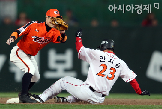 [인천=아시아경제 정재훈 기자] 26일 오후 인천 문학야구장에서 열린 '2013 한국야쿠르트 세븐프로야구' SK 와이번스와 한화 이글스의 경기. 4회말 2사 1루 상황 1루주자 안치용이 2루 도루에 성공하고 있다.정재훈 기자 roze@<ⓒ세계를 보는 창 경제를 보는 눈, 아시아경제(www.asiae.co.kr) 무단전재 배포금지>