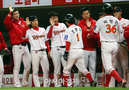 [인천=아시아경제 정재훈 기자] 26일 오후 인천 문학야구장에서 열린 '2013 한국야쿠르트 세븐프로야구' SK 와이번스와 한화 이글스의 경기. 7회말 1사 1,2루 상황 조인성의 2타점 적시타에 홈을 밟은 조동화, 박정권이 동료들의 환영을 받고 있다.정재훈 기자 roze@<ⓒ세계를 보는 창 경제를 보는 눈, 아시아경제(www.asiae.co.kr) 무단전재 배포금지>