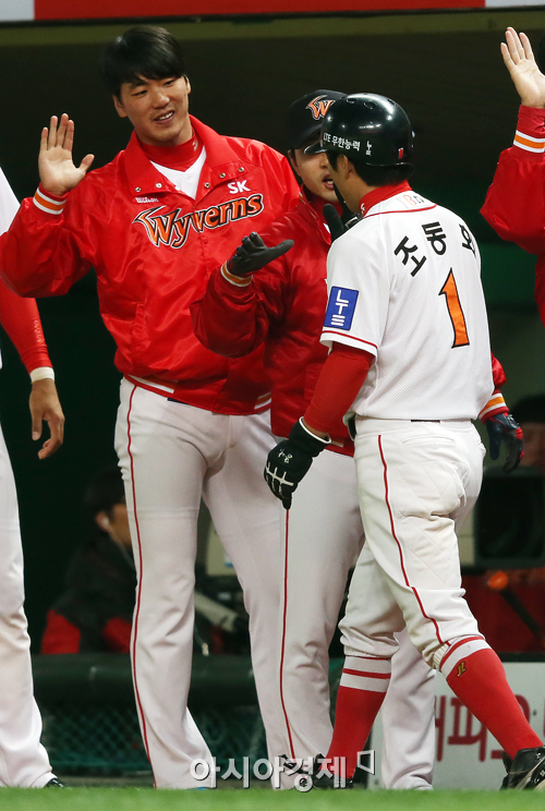[인천=아시아경제 정재훈 기자] 26일 오후 인천 문학야구장에서 열린 '2013 한국야쿠르트 세븐프로야구' SK 와이번스와 한화 이글스의 경기. 7회말 1사 1,2루 상황 조인성의 2타점 적시타에 홈을 밟은 조동화, 박정권이 동료들의 환영을 받고 있다.정재훈 기자 roze@<ⓒ세계를 보는 창 경제를 보는 눈, 아시아경제(www.asiae.co.kr) 무단전재 배포금지>