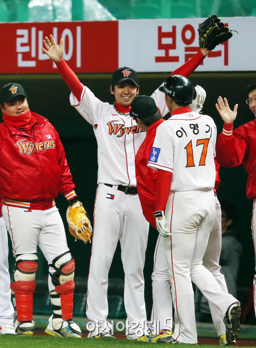 [인천=아시아경제 정재훈 기자] 26일 오후 인천 문학야구장에서 열린 '2013 한국야쿠르트 세븐프로야구' SK 와이번스와 한화 이글스의 경기. SK 선발투수 윤희상이 7회말 2사 최정의 만루홈런에 홈을 밟은 1루주자 이명기를 반기고 있다.정재훈 기자 roze@<ⓒ세계를 보는 창 경제를 보는 눈, 아시아경제(www.asiae.co.kr) 무단전재 배포금지>
