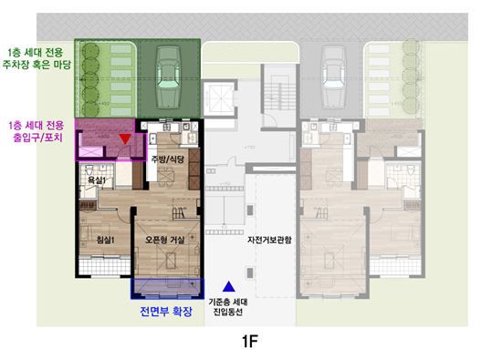 저층부를 타운하우스형 복층으로 계획, 전용 출입구 및 내집 앞에 전용공간을 마련한 타운하우스형. /