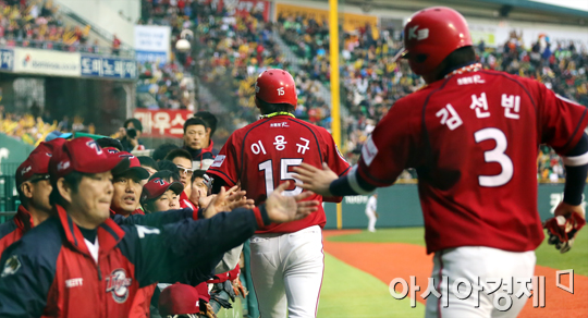 [아시아경제 정재훈 기자] 30일 오후 서울 잠실야구장에서 열린 '2013 한국야쿠르트 세븐프로야구' 두산 베어스와 KIA 타이거즈의 경기. 1회초 1사 2,3루 상황 나지완의 2타점 적시타에 2,3루 주자 이용규, 김선빈이 홈인하고 있다.정재훈 기자 roze@<ⓒ세계를 보는 창 경제를 보는 눈, 아시아경제(www.asiae.co.kr) 무단전재 배포금지>