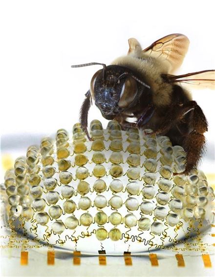 [아시아경제 김보경 기자] 곤충의 겹눈 구조를 응용해 160도 이상의 화각으로 전방위 촬영이 가능한 초광각 디지털 카메라를 한국인이 세계 최초로 개발했다. 송영민(32) 미국 일리노이대 연구원과 존 로저스 일리노이대 교수, 미국 하버드대 및 노스웨스턴대 연구진은 이같은 내용의 연구결과를 2일 네이처지에 발표했다. 송 박사는 2011년 광주과학기술원 정보기전공학부에서 박사학위를 받았다. 잠자리·파리 등 곤충의 눈은 수천~수만 개의 홑눈이 겹겹이 모여 있는 겹눈 구조로 이뤄졌다. 겹눈은 볼록한 모양을 하고 있어 가만히 있어도 사방을 볼 수 있고 물체와의 거리에 상관없이 선명한 영상을 얻을 수 있는 '무한 심도' 기능을 지니고 있다. 이 때문에 과학계는 그동안 곤충의 눈을 모방한 카메라를 개발하기 위해 연구를 진행했지만 기술적 한계로 그 구조를 일부 모방하는 데 그쳤다. 일반 카메라 중에도 광각렌즈나 어안렌즈 등 일반 렌즈보다 넓은 화각의 렌즈를 활용한 것이 있지만 실물의 이미지가 왜곡되는 단점이 있다.송영민 박사 연구팀은 곤충 눈 카메라를 개발하기 위해 잡아당기면 늘어나는 형태의 이미지 센서를 만들었다. 이어 이 센서를 고무재질로 된 마이크로렌즈 배열에 부착시킨 후 반구형 모양으로 변형시켜 곤충의 겹눈 구조와 유사한 초광각 카메라를 만들었다. 초광각 카메라는 곤충 눈과 구조, 기능이 거의 동일한 것으로 160도 이상의 화각을 갖고 있다. 간단한 구성이지만 이미지 왜곡이 발생하지 않아 기존 광각 카메라의 단점도 극복한 것으로 평가받고 있다. 또 무한 심도 기능도 갖춰 물체와의 거리와 관계없이 선명한 영상을 얻을 수 있는 장점도 지녔다. 향후 이 카메라는 무인 비행로봇용 감시카메라, 전방위 물체 감지 센서, 초소형 광각 내시경, 보급형 초광각 디지털 카메라 등 다양한 분야에 응용 가능할 것으로 기대된다. 송 박사는 "겹눈 구조를 통해 광학적으로 어떤 상이 맺히는지를 실험적으로 보인 경우는 이번이 처음"이라며 "렌즈의 구조를 만드는 데 그친 것이 아니라 사진 촬영이 가능한 카메라를 제작해 곤충 눈에 보이는 이미지가 어떤 형태이며 어떤 특징을 갖는지 밝혀냈다는 점에서 의미가 크다"고 말했다. 김보경 기자 bkly477@<ⓒ세계를 보는 창 경제를 보는 눈, 아시아경제(www.asiae.co.kr) 무단전재 배포금지>