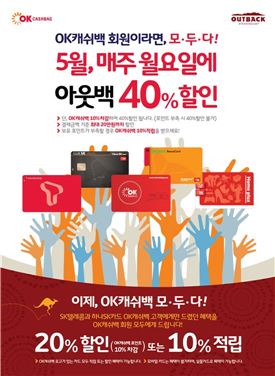 [아시아경제 오주연 기자]아웃백 스테이크하우스는 가정의 달을 맞아 OK캐쉬백 회원들을 위해 특별한 선물을 준비했다고 2일 밝혔다.아웃백은 T멤버십, 엔크린 보너스카드 등을 대상으로 진행해 왔던 상시 20%할인 또는 10%적립 혜택을 5월부터 OK캐쉬백 모든 카드를 대상으로 확대 제공된다. 이를 기념해 5월 한달 간 매주 월요일에는 아웃백을 특별히 40%할인된 가격에 즐길 수 있다. 결제금액의 10%에 해당하는 OK캐쉬백을 보유하고 있어야만 혜택을 받을 수 있으며 OK캐쉬백이 부족할 시에는 10%적립만 가능하다. 또한 결제금액 기준 최대 20만원까지 할인 혜택을 받을 수 있어 가정의 달 가족끼리 외식할 장소를 고민하는 아웃백 고객들에게 반가운 소식이다. OK캐쉬백 로고가 있는 모든 카드로 적립 또한 할인이 가능하다. (모바일카드 혜택 불가) 더불어 5월 한달 간 신한카드와 씨티카드로 아웃백을 이용할 경우에도 특별한 혜택을 준다. 12세 미만 어린이와 함께 매장을 방문해 신한카드로 결제하면 키드 찹스테이크와 매장에서 직접 짜낸 신선한 과일 주스, 하겐다즈 바닐라 아이스크림으로 구성된 어린이 풀코스 세트를 무료로 제공한다. 또한 아웃백에서 씨티카드로 결제하면 1만원 할인혜택과 씨티포인트 보유 시, 최대 30%까지 차감 할인혜택을 동시에 받을 수 있어 5월 내내 합리적인 가격으로 아웃백을 즐길 수 있다.오주연 기자 moon170@<ⓒ세계를 보는 창 경제를 보는 눈, 아시아경제(www.asiae.co.kr) 무단전재 배포금지>