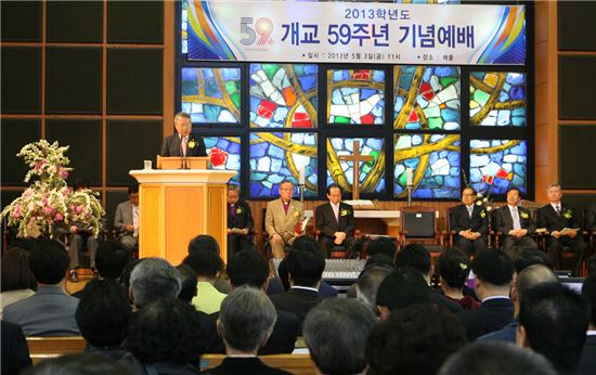 목원대가 개교 59주년을 맞아 3일 교내 채플실에서 개교기념식을 열었다. 김원배 총장이 기념사를 하고 있다.