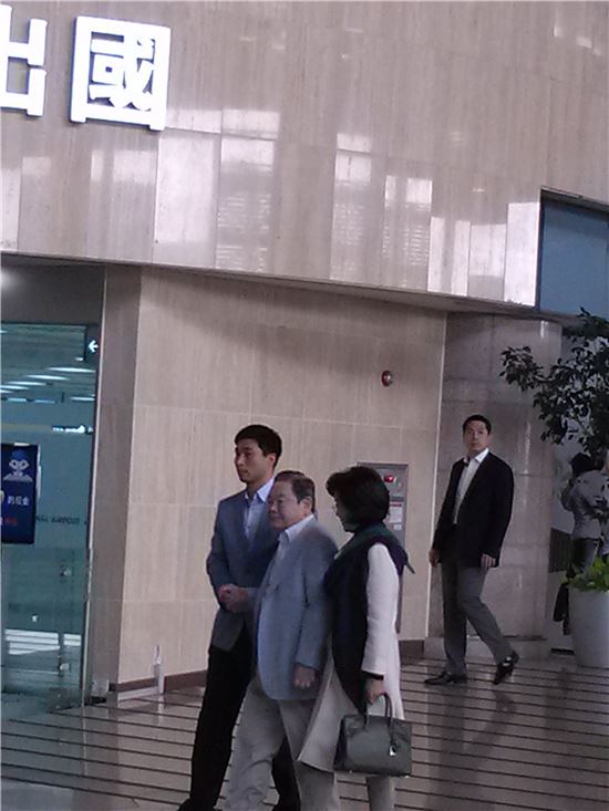 ▲이건희 삼성그룹 회장(가운데)이 경호원의 부축을 받으며 부인 홍라희 여사(오른쪽)와 함께 김포공항 출국장으로 나가고 있다.