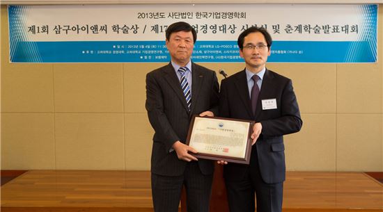 4일 고려대학교 LG-POSCO 경영관에서 박광태 한국기업경영학회 회장(오른쪽)이 박장수 아식스 코리아 사장(왼쪽)에게 '기업경영대상'을 수여한 후 함께 기념 촬영을 하고 있다.<br />