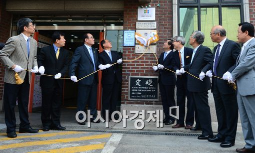 [아시아경제 백소아 기자] 6일 서울 종로구 중앙성결교회에서 열린 '행복한 작은 도서관' 개관식에서 (왼쪽 네번째부터)박위근 한국교회연합 대표회장과 박원순 서울시장이 현판식에서 제막을 걷고 있다. 이날 서울시와 한국교회연합은 작은 도서관 활성화 및 책 읽는 서울 구현을 위한 업무협약을 체결하고 '행복한 작은 도서관' 100곳을 조성하기로 했다.백소아 기자 sharp2046@<ⓒ세계를 보는 창 경제를 보는 눈, 아시아경제(www.asiae.co.kr) 무단전재 배포금지>