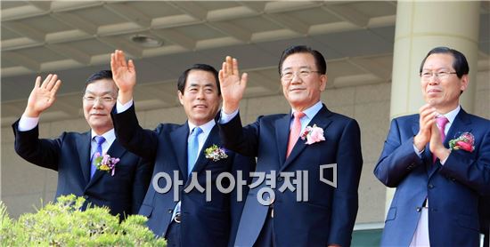 7일 오후 전남 장흥 공설운동장에서 '제52회 전라남도체육대회' 개막식이 열린 가운데 박준영 도지사를 비롯해 이명흠 장흥군수, 김재무 도의장, 장만채 교육감이, 시장·군수 등 내빈들이 입장하는 선수단에 손을 흔들고 있다. 희망의 땅 장흥에서 열리는 이번 전라남도체육대회는 ‘함께 뛰는 전남체전’의 대회 슬로건 아래 육상, 수영 등 22개 종목(정식 20, 시범 2)에서 시·군대항전으로 4일간 열린다. 사진제공=전남도노해섭 기자 nogary@ <ⓒ세계를 보는 창 경제를 보는 눈, 아시아경제(www.asiae.co.kr) 무단전재 배포금지>