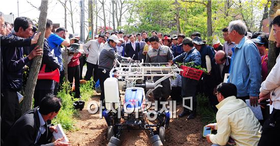 전북 고창군은 관내 농업인과 관계 공무원 100명이 참석한 가운데 지난 8일 공음 학원농장에서 ‘고구마·고추 본밭 자동이식기 시연회’를 개최했다.이날 선보인 고구마, 고추 자동 이식기는 노동력을 절감하여 생산성을 높일 수 있고, 경사지 포장에서도 작업이 가능하도록 유압식 균평 장치를 갖추고 있으며, 관수장치를 부착해 활착률을 높인 것이 특징이다.고구마와 고추 재배에서 이식 작업은 현재까지는 기계화가 불가능했지만, 이번 시연회를 통해 이르면 내년부터 농가에서 활용할 수 있을 것으로 전망된다.농업기술센터 관계자는 “자동이식기의 시간당 작업능력은 약 2,000주로 10a당 작업소요 시간은 3시간 정도이며, 관행 수작업에 비해 80% 이상 노동력을 절감할 수 있다”고 말했다.한편, 고창군은 광활한 야산개간지를 활용 고구마 재배면적이 약 1,500ha로 전국 8%, 전라북도 47%를 차지하며 웰빙 시대에 걸맞게 고구마 인기가 매년 상승하면서 재배농가도 늘어나는 추세이다.또한, 고추는 1,300ha, 5,000여 농가 규모로 2011년에 고추종합처리장을 완공, 2012년부터 고추 수매 및 가공판매를 추진하여 명품고추 산업 육성에 박차를 가하고 있다.김재길 기자 <ⓒ세계를 보는 창 경제를 보는 눈, 아시아경제(www.asiae.co.kr) 무단전재 배포금지>
