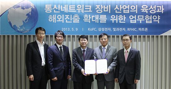 한국정책금융공사는 9일 통신 네트워크 장비 산업의 육성과 해외진출 확대 등을 위해 삼성전자, 빛과전자, 파트론, RFHIC 등 관련 분야 대·중소기업과 업무협약을 체결했다. 사진은 (왼쪽부터) 파트론 오기종 상무, RFHIC 조덕수 대표이사, 삼성전자 박준호 전무, 정책금융공사 나성대 본부장, 빛과전자 김홍만 대표이사가 기념촬영을 하는 모습.