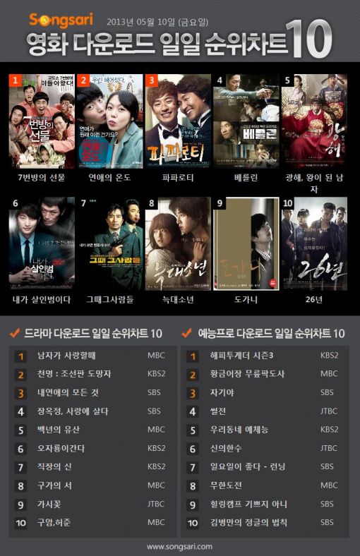 [아시아경제 진주희 기자]영화 다운로드 전문 웹하드 ‘송사리’에서 백상예술대상 대상에 빛나는 ‘류승룡’ 주연의 ‘7번방의 선물’이 다시 한번 다운로드 순위 1위에 올랐다.지난 9일 진행된 백상예술대상에서 21년의 무명의 설움을 날려 버리고 최고의 영예인 대상을 거머쥔 ‘류승룡’은 현재 충무로의 최고 핫이슈로 자리잡았다.류승룡 주연의 ‘7번방의 선물’외 ‘광해 왕이된 남자’도 백상예술대상에 작품상을 받아 다운로드 순위 5위로 재진입해 눈길을 끌었으며, 이로써 류승룡 주연 및 조연의 영화가 두 편이나 다운로드 순위에 이름을 올렸다.2위 역시 백상예술대상에서 여자 최우수 연기상을 수상한 ‘김민희’ 주연의 ‘연애의 온도’가 차지 하였으며 어제 다운로드 순위 1위를 기록한 ‘한석규’ ‘이제훈’ 주연의 ‘파파로티’는 두단계 하락한 3위를 보였으나, 역시 만만치 않은 다운로드 수를 기록하고 있다.4위는 하정우. 전지현. 류승범 주연의 첩보액션 대작 ‘베를린’ 이 차지하였으며, ‘박시후’ 고소했던 A양이 고소를 취하했다는 소식과 함께 실시간 검색어 상위에 오르며 ‘박시후’ 주연의 ‘내가 살인범이다’가 6위로 재진입하여 꾸준히 다운로드 수를 늘려가고 있다.이밖에 고 박정희 전대통령의 시해사건을 다룬 ‘그때 그 사람들’이 어제에 이어 두 단계 상승하여 박근혜 정부의 관심을 간접적으로 비췄으며 늑대소년, 도가니,가 그 뒤를 이어갔다.‘도가니’가 순위에 오른 것은 ‘윤창중’ 청와대 대변인이 성추행 사건으로 경질됐다는 뉴스로 인하여 성추행 관련 영화로서 다시 한번 순위권에 재진입 한 것으로 해석된다.10위 ‘26년’은 한혜진 주연의 영화로서 한혜진과 기성용의 7월 결혼 발표로 화제를 일으키며 순위에 랭크 되었다.드라마 일일 다운로드부문에서는 수목 드라마 ‘남자가 사랑할 때’와 ‘천명’ ‘내 연애의 모든 것’ 지상파 3개 드라마가 1,2,3,위를 차지 했으며, 그밑으로는 주중 방영되었던 드라마들이 순위를 이어가고 있다.예능 부문차트에서는 목요일 예능 ‘해피투게더 시즌3’가 다운로드 1위에 올랐으며 ,’황금어장 - 무릎팍도사’ ’자기’등 목요일 밤 예능 프로가 상위권에 이름을 올렸다. 진주희 기자 ent1234@<ⓒ아시아경제 & 스투닷컴(stoo.com)이 만드는 온오프라인 연예뉴스>