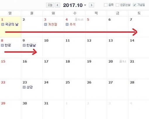 [아시아경제 진주희 기자]'2017년 황금연휴'가 네티즌들의 관심을 받고 있다.최근 온라인 커뮤니티 게시판에는 '2017년 황금연휴' 제목으로 사진이 게재됐다.공개된 사진에는 2017년 9월말부터 10월초에 걸친 황금연휴가 나열되어 있다.2017년 9월 30일부터 10월 9일까지 주말, 개천절, 추석연휴, 한글날을 포함 8일이 공휴일로 지정된다. 특히 더불어 2017년 10월 2일과 6일은 평일이지만, 징검다리 휴일을 적용하는 기업의 경우 최대 10일의 연휴를 누릴 수 있다.'2017년 황금연휴' 사진을 본 네티즌들은 "2017년까지 4년 남았네", "완전 대박", "징검다리 적용 할 회사가 있을까?" 등의 반응을 보였다.진주희 기자 ent1234@<ⓒ아시아경제 & 스투닷컴(stoo.com)이 만드는 온오프라인 연예뉴스>'