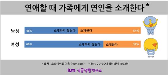 [아시아경제 오주연 기자]남성은 여자친구와의 관계 발전을 위해 가족에게 연인을 소개하려하지만, 여성은 가족에게 좀체 남자친구를 소개하려하지 않는 것으로 나타났다.소셜데이팅 이음은 지난 6일부터 13일까지 20~30대 성인남녀 1023명(남 506명, 여 517명)을 대상으로 ‘연인과 가족 사이’에 대한 설문조사를 진행했다. 그 결과 남성 응답자의 54%가 ‘연애할 때 가족에게 연인을 소개한다’고 답한 반면 여성 응답자의 68%가 ‘연애할 때 연인을 소개하지 않는다’고 대답해 남녀 간 성향에 큰 차이가 있는 것으로 나타났다.남성이 가족에게 연인을 소개하는 이유로는 ‘여자친구와 좀 더 진지한 관계로 발전하길 원해서(51%)’라는 답변이 가장 많았다. 다음으로 ‘우연한 기회에 자연스럽게(30%)’가 2위, ‘가족들이 궁금해해서(17%)’가 3위, ‘여자친구가 졸라서(2%)가 4위를 차지했다.