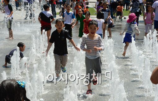 [아시아경제 백소아 기자] 서울 낮 기온이 27도를 기록하며 초여름 날씨를 보인 17일 서울 광화문 광장 분수대에서 어린들이 더위를 식히고 있다.백소아 기자 sharp2046@<ⓒ세계를 보는 창 경제를 보는 눈, 아시아경제(www.asiae.co.kr) 무단전재 배포금지>