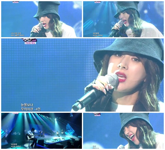 [아시아경제 유수경 기자]가수 서인영이 애절한 발라드를 선보이며 눈물샘을 자극했다.서인영은 17일 오후 방송한 KBS2 '뮤직뱅크' 700회 특집에서 신곡 '헤어지자'를 열창했다.타이틀곡 '헤어지자'는 그간 화려했던 서인영의 이미지를 반전시키는 곡으로, 이별을 예감한 여성의 심리를 매우 사실적이면서도 덤덤하게 표현해낸 가사가 백미다.'뮤직뱅크'는 지난 1998년 6월 '가요 톱 10'의 뒤를 이어 첫 선을 보인 뒤 대표적인 생방송 음악 프로그램으로 자리 잡았다. 공정성 논란에 휘말리며 한동안 순위제도를 폐지했다가 2008년 1월 '케이 차트(K-Chart)'라는 이름 아래 순위제를 부활시켰고, 현재까지 이어오고 있다. 이날 '뮤직뱅크' 700회 특집은 다채로운 무대로 꾸며졌다. 소녀시대는 활동기간이 아님에도 불구, '뮤직뱅크' 700회를 축하하기 위해 무대에 선다. 샤이니는 데뷔곡 '누난 너무 예뻐'와 신곡 '와이 소 시리어스'(Why So Serious)를 함께 선보인다.이밖에도 다이나믹 듀오와 사이먼 디, 리듬파워 등 힙합 군단의 히트곡 메들리가 펼쳐지며 신화, 2PM, 서인영의 신곡 무대를 만날 수 있다.퇴원한 현아가 합류한 포미닛은 신화의 히트곡을 부르는 특별 무대를 마련했고 시크릿, 에일리, 케이윌, 나인뮤지스가 다시 부르는 '뮤직뱅크' 역대 1위곡 공연도 준비됐다.유수경 기자 uu84@<ⓒ아시아경제 & 스투닷컴(stoo.com)이 만드는 온오프라인 연예뉴스>
