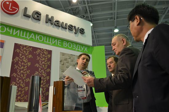 LG하우시스 관계자가 카자흐스탄 최대 건자재 전시회인 '2013년 아스타나 빌드'에서 전시장을 찾은 전시회 관람객들에게 LG하우시스 제품에 대해 설명하고 있는 모습.