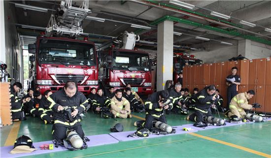 광주 남부소방서(서장 채희권)는 지난 22일부터 23일까지 청사 훈련장에서 119안전센터 및 구조대 119명을 대상으로 공기호흡기장착 및 기구 묶기 등 소방전술훈련 자체 평가를 실시했다. 이날 평가는 평소 하루 2시간 이상 개인별 소방전술훈련 및 팀별 훈련을 실시한 기량을 평가 받았다.장하진 현장대응과장은 “평소에 전술훈련을 반복 숙달해야만 실제 재난현장에서 소방대원으로서 역할을 다할 수 있다”고 말했다.박선강 기자 skpark82@<ⓒ세계를 보는 창 경제를 보는 눈, 아시아경제(www.asiae.co.kr) 무단전재 배포금지>