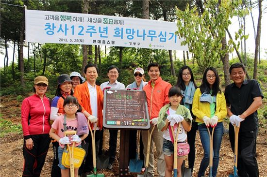 창립 12주년을 맞은 현대홈쇼핑은 25일 강동구 명일동 훼손된 산림지역에 4천그루의 희망나무심기 행사를 진행했다. 김인권 현대홈쇼핑 대표(표지판 좌측)와 이해식 강동구청장(표지판 우측)을 비롯해 현대백화점 천호점 고객들과 자녀들이 기념 식수 후 사진 촬영을 하고 있다.