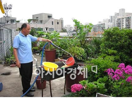 송파구 가락동에 사는 홍윤표씨가 옥상에서 빗물을 모아 식물들에게 주고 있다. 사진제공=서울시