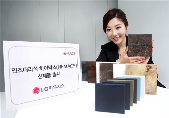 LG하우시스 인조대리석 신규 브랜드 '하이막스'를 들고 모델이 포즈를 취하고 있는 모습.